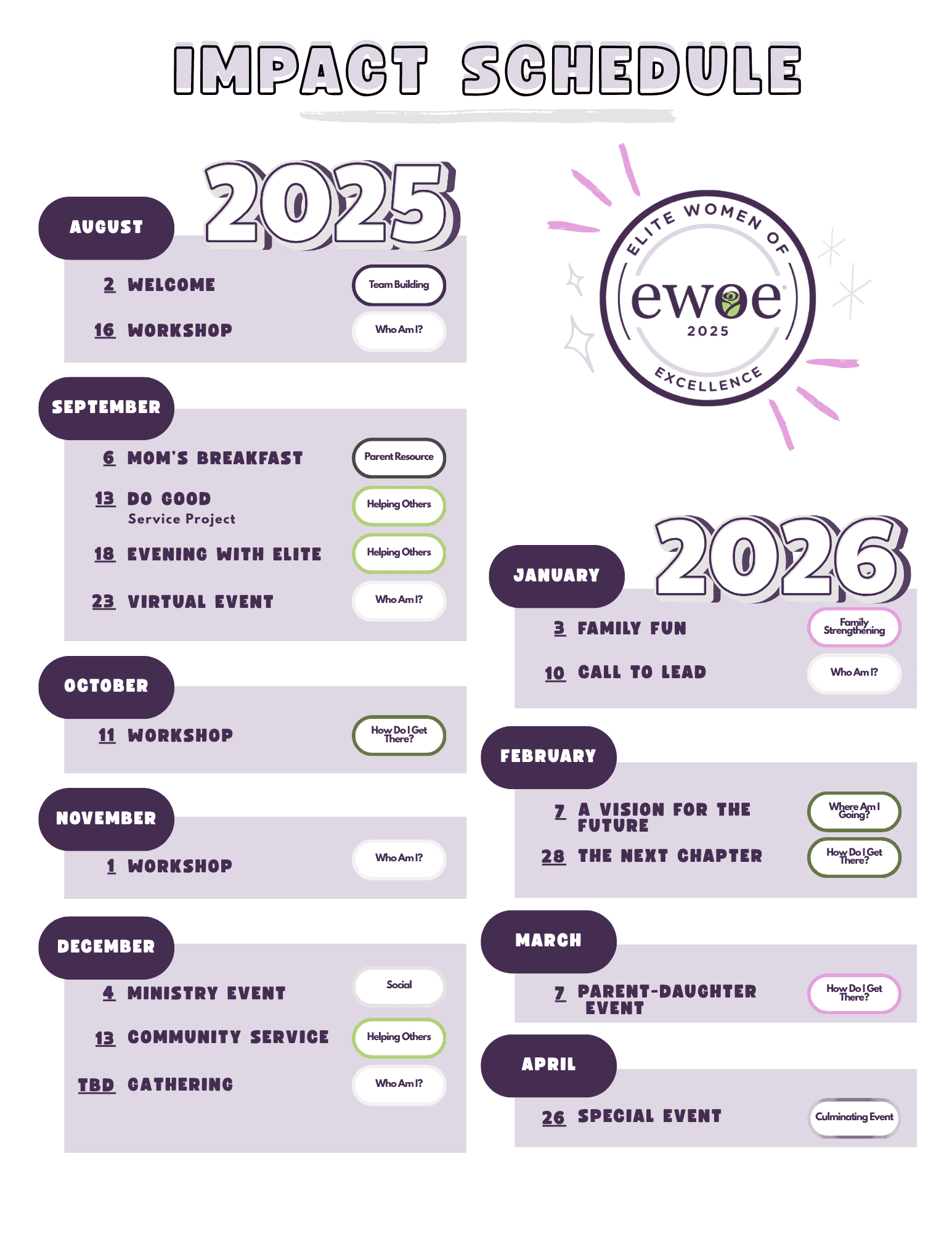 Elite Women of Excellence comes alongside teen girls to help them discover their purpose and passion, support the making of moral choices through biblical principles, strengthen family relationships, develop a foundation of confidence, and provide an environment where they can experience the unconditional love of Jesus Christ.